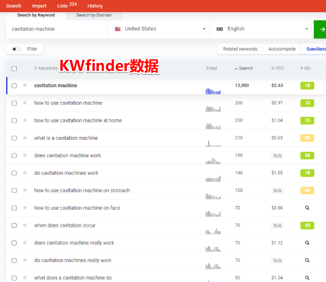 如果不夠,還可以查找cavitation machine的變體詞,如ultrasonic cavitation machine,ultrasonic cavitation等,并將該變體詞放入工具拓詞,步驟同上。因為新加了一個ultrasonic,拓出的問題詞可能會有所不同。