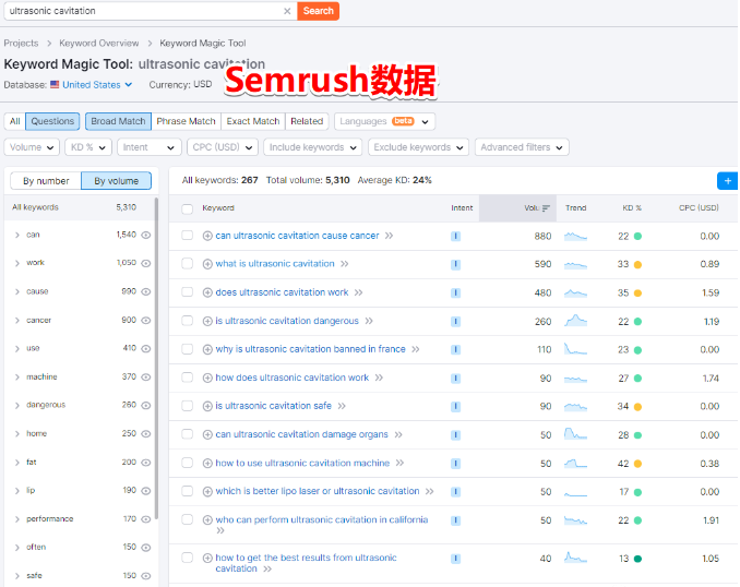 1)在Semrush或KWfinder輸入can ultrasonic cavitation cause cancer拓詞