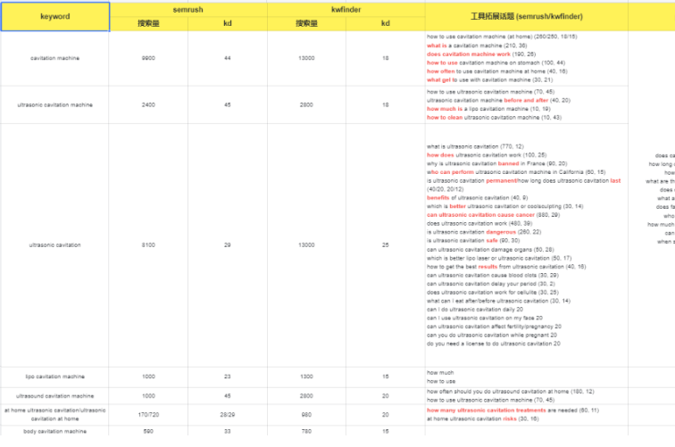 以下是我們自己內部做的一份cavitation machine關鍵詞調研表。