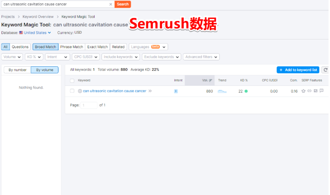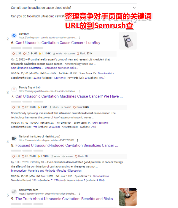 通過調研,我們可以發現can ultrasonic cavitation cause cancer這個關鍵詞搜索量大,競爭難度低,適合作為一篇文章的主題關鍵詞。我將以它為例繼續下面的步驟。