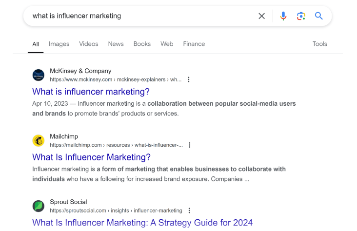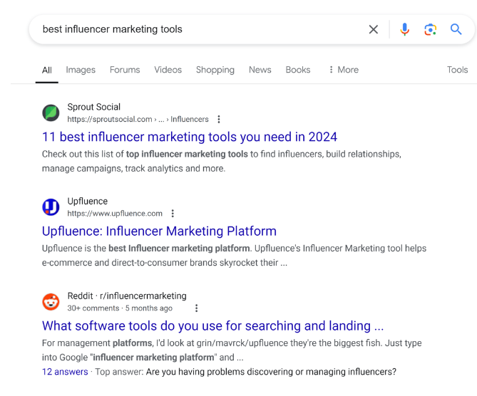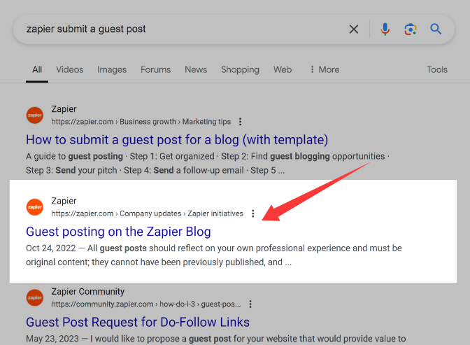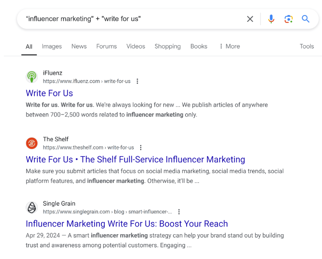 例如,如果您銷售有影響力的營銷軟件,您可以在 Google 上使用字符串“有影響力的營銷”+“來賓帖子”來查找您所在領域的相關出版物。如圖: