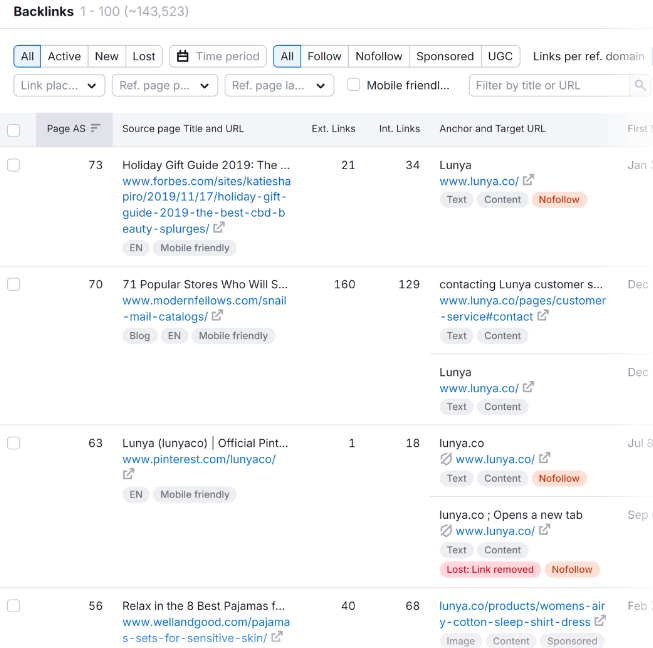該表將顯示詳細信息,例如反向鏈接的來源、使用的錨文本、鏈接類型(Dofollow 或 nofollow)以及鏈接域的權威分數。如圖: