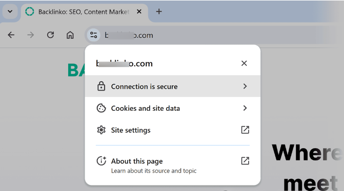 要檢查您的網站是否使用 HTTPS,請查看瀏覽器地址欄中的 URL。點擊 URL 旁邊的圖標。如果顯示“連接安全”,則您的網站使用 HTTPS。如圖: