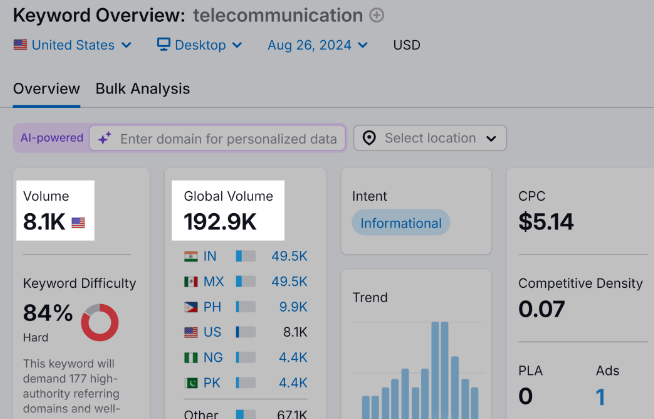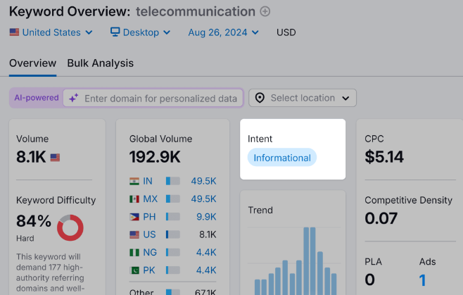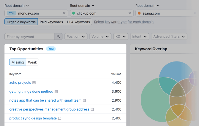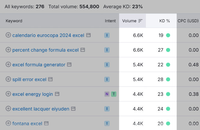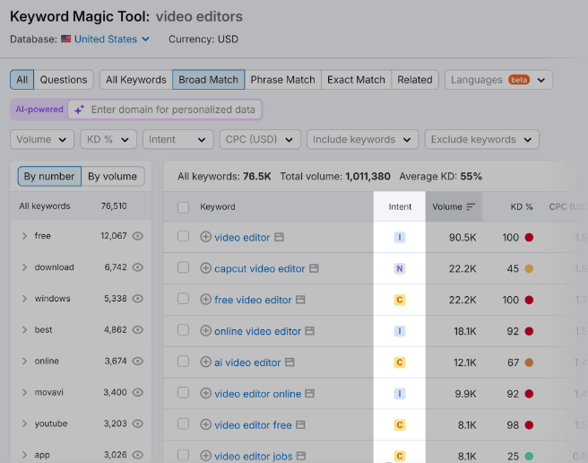 這些工具可以訪問大量關鍵詞數據庫。利用它們可以找到各種相關關鍵詞。此外,還可以找到每個關鍵詞的其他信息,例如搜索量、KD%、搜索意圖等。