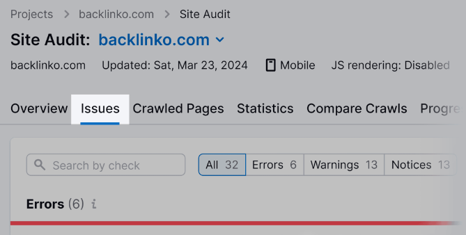 設置項目后,導航到“問題”選項卡,然后在搜索欄中搜索“移動”等關鍵字。如圖: