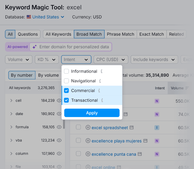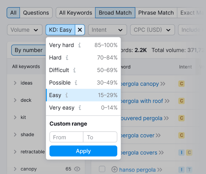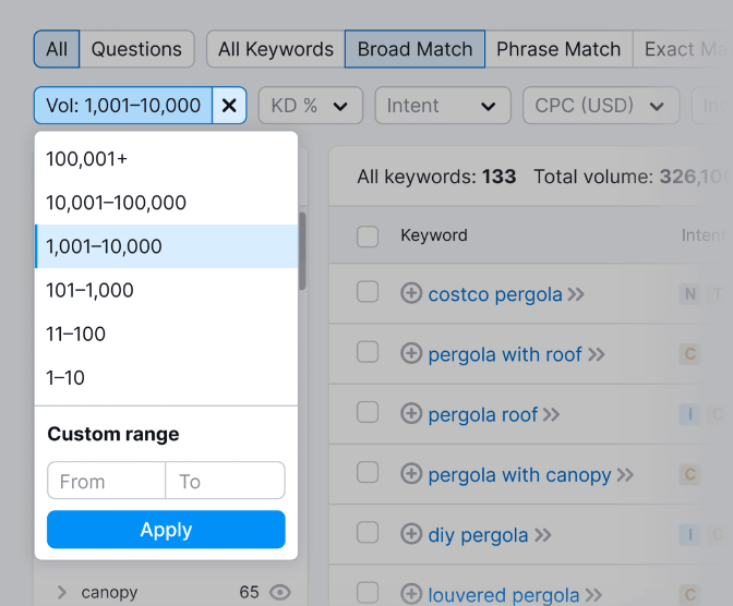 關鍵詞研究工具還允許您通過不同的參數(搜索量、KD%、搜索意圖、問題)過濾關鍵詞,以幫助您縮小搜索范圍。