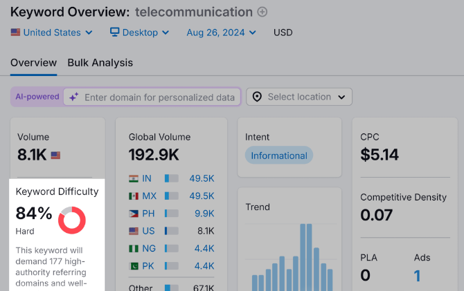 關鍵詞難度 (KD%):一個指標,表示創建排名在特定關鍵詞的 SERP 前 10 個結果中的內容的難度。如圖: