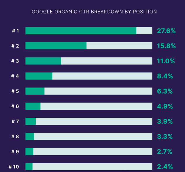 我們對超過 400 萬個 Google 搜索結果的研究。結果顯示,第一個自然搜索結果占所有點擊量的 27.6%。第二個結果的點擊量下降到 15.8%,第三個結果的點擊量下降到 11%。依此類推。
