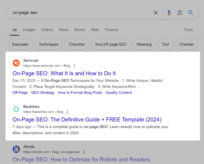 對于“頁面搜索引擎優化”查詢,排名前兩個的結果是 Semrush 和 Backlinko。如圖:
