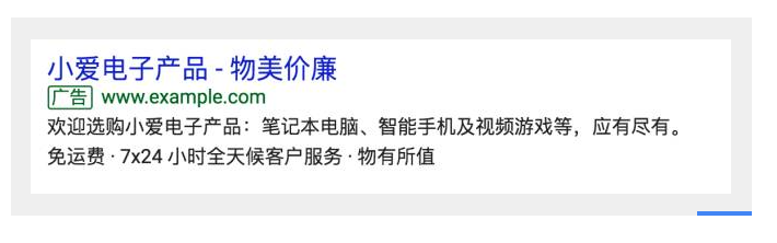 宣傳信息就是在廣告中添加其他文字,如“免費送貨”或“全天候客戶支持”等相關信息,吸引顧客實現線上線下轉化。附加關聯商戶地址信息可幫助用戶查找附近的銷售您產品的商店,以便用戶就近購買。如圖: