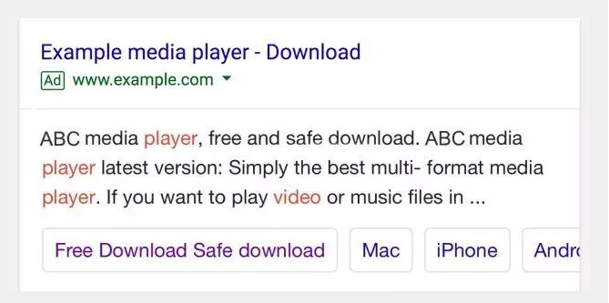 如果想推廣您的App,那就選擇添加應用信息吧。它可以在全球范圍內向使用Android和iOS系統的移動設備用戶展示A,吸引他們下載應用。如下圖視頻播放器的搜索結果直接列出了各個設備適用的下載鏈接,非常便捷。如圖: