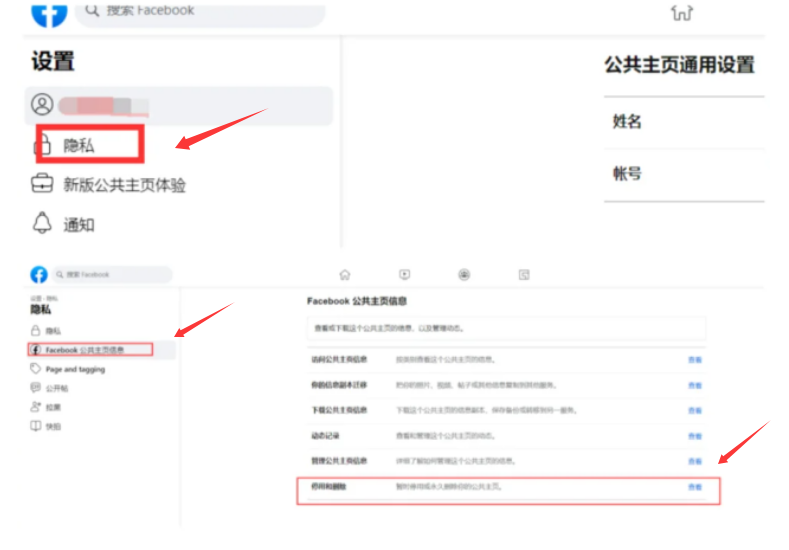 5、點擊Facebook公共主頁信息>>>點擊停用和刪除右側的查看按鈕,如圖: