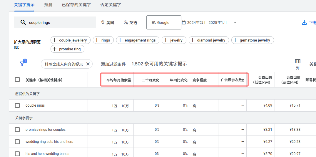 在關(guān)鍵詞規(guī)劃師中,Google會(huì)提供一系列數(shù)據(jù)指標(biāo),幫助你理解每個(gè)關(guān)鍵詞的表現(xiàn)。這些指標(biāo)包括: