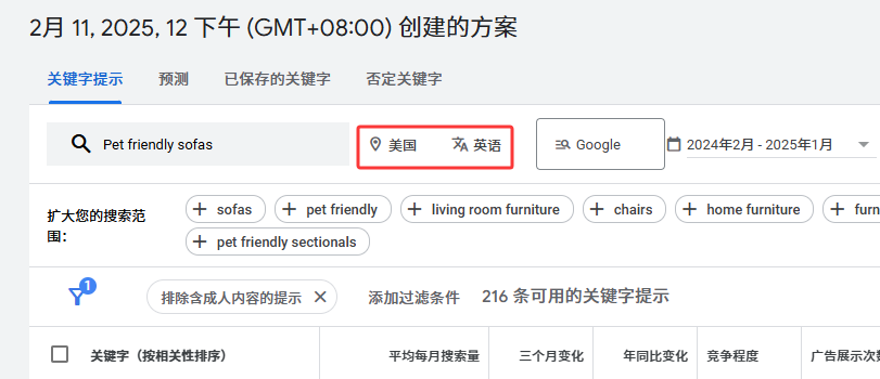 Google 關(guān)鍵詞規(guī)劃工具在這個(gè)案例中,我們排除了搜索量低于 30 的關(guān)鍵詞,以及一些競(jìng)爭(zhēng)對(duì)手的品牌詞和與皮革沙發(fā)相關(guān)的關(guān)鍵詞。