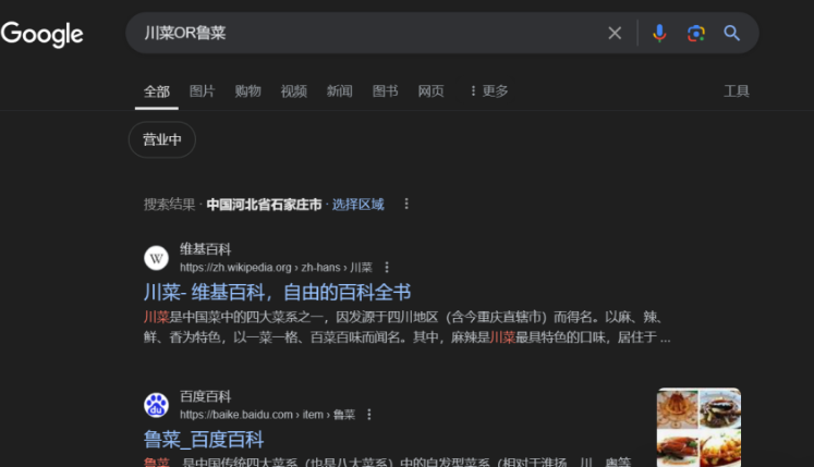 比如,我們想川菜或者魯菜的烤制方法。輸入搜索指令:川菜OR魯菜