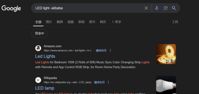 這個(gè)技巧常被用于外貿(mào)開發(fā)客戶,通過(guò)在關(guān)鍵詞前面加個(gè)減號(hào)-,排除該關(guān)鍵詞相關(guān)的結(jié)果。比如,我們想要查找LED燈的供應(yīng)商,但不想看到來(lái)自阿里巴巴的結(jié)果。