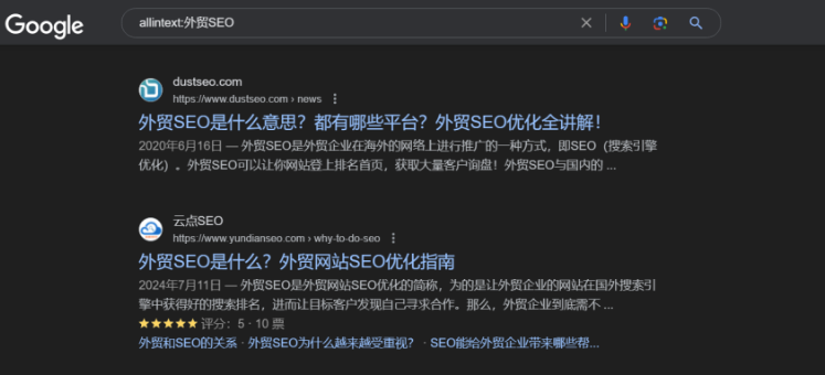 比如,我們想要查找正文中含有外貿(mào)SEO這個(gè)關(guān)鍵詞的頁(yè)面。輸入搜索指令:allintext:外貿(mào)SEO