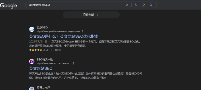 比如,我們想要查找標(biāo)題中包含英文SEO這個(gè)關(guān)鍵詞的頁(yè)面。輸入搜索指令:allintitle:英文SEO