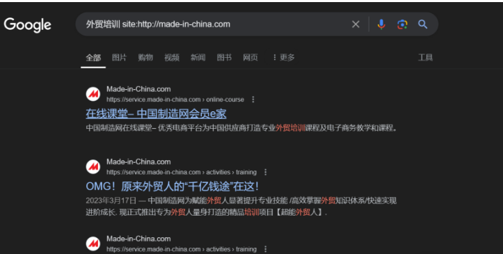 比如,我們想要在本站查找有關(guān)“外貿(mào)培訓(xùn)”的內(nèi)容。輸入搜索指令:外貿(mào)培訓(xùn) site:http://made-in-china.com