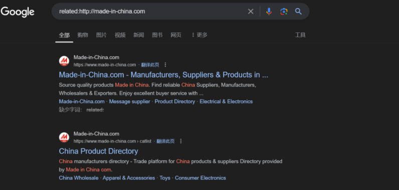 比如,我們想要查找與中國(guó)制造網(wǎng)網(wǎng)站相似的其他站點(diǎn)。輸入搜索指令:related:http://made-in-china.com