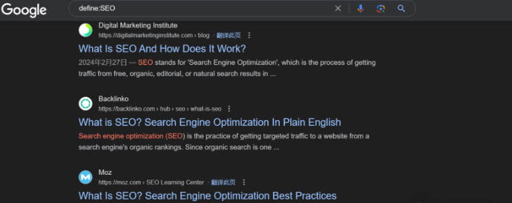示例:查找SEO的定義,語(yǔ)法:define:SEO