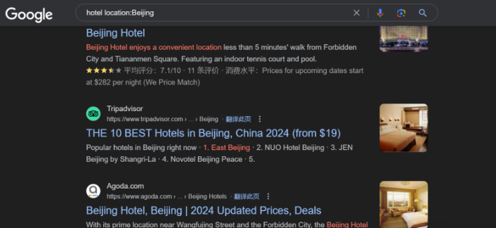 比如,我們想要查詢北京的酒店。輸入搜索指令:hotel location:Beijing