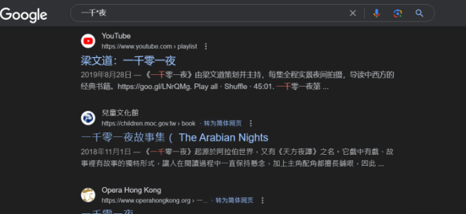 比如,我們想要查找一千零一夜童話,但只記得一千和最后的夜字。輸入搜索指令:一千*夜