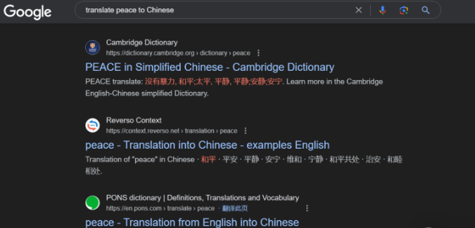 比如,我們想把Peace翻譯為中文。輸入搜索指令:translate peace to Chinese