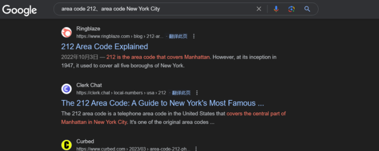 查詢212所對(duì)應(yīng)的地區(qū)、查詢紐約的區(qū)號(hào)。輸入搜索指令:area code 212、area code New York City