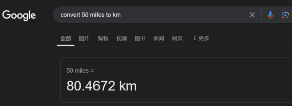 比如,我們想知道50英里等于多少千米。輸入搜索指令:convert 50 miles to km