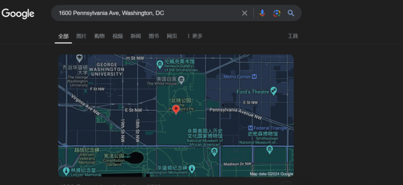 比如,我們想知道華盛頓特區(qū)賓夕法尼亞大道1600號(hào)的郵編。輸入搜索指令:1600 Pennsylvania Ave, Washington, DC