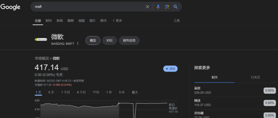 在谷歌搜索框中輸入某個(gè)公司的股票代碼,即可看到其具體信息。
