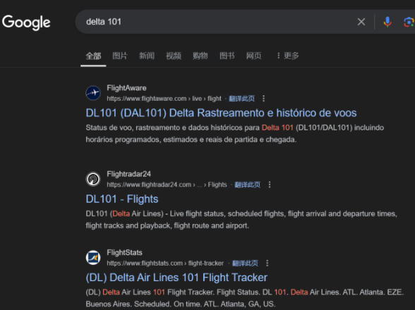 比如,我們想要查看下達(dá)美航空101號(hào)航班的信息。輸入搜索指令:delta 101