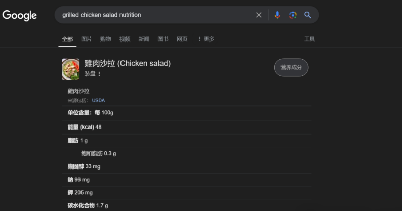 比如,我們想要知道雞肉沙拉的營(yíng)養(yǎng)信息。輸入搜索指令:grilled chicken salad nutrition