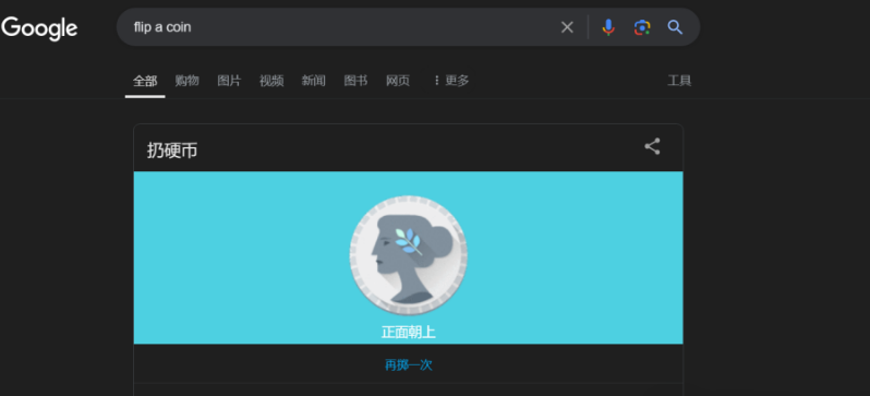 比如,拋硬幣游戲。輸入搜索指令:flip a coin
