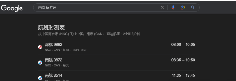 比如,我們想要查看南京到廣州的航班路線,輸入搜索指令:南京 to 廣州