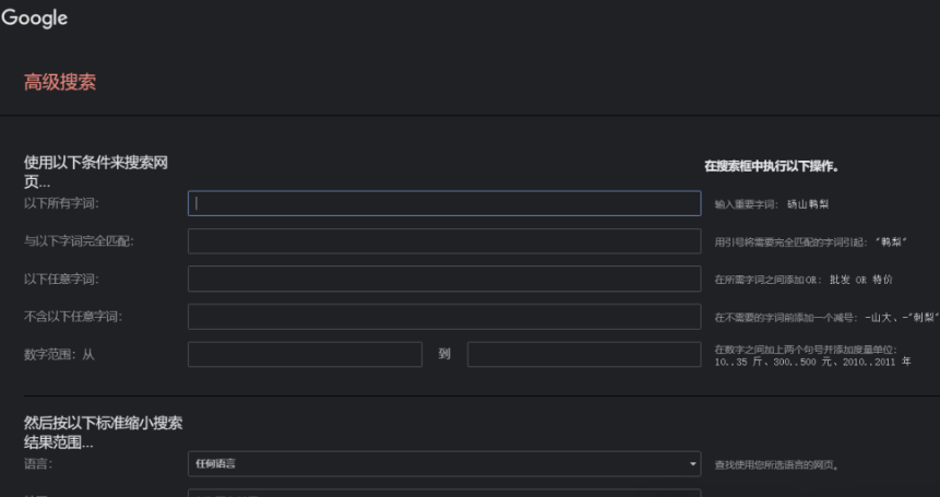 如果你不想使用各類的搜索指令,那么你可以選擇使用谷歌的高級(jí)搜索功能來(lái)縮小搜索結(jié)果的范圍。在高級(jí)搜索中,你可以指定語(yǔ)言、區(qū)域、發(fā)布時(shí)間、文件類型等搜索條件。