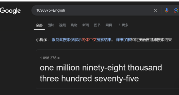 谷歌還可以將數(shù)字轉(zhuǎn)換成文字。當(dāng)你需要大量的文字形式的數(shù)字時(shí),這個(gè)功能真的很有用。例如:輸入搜索指令 “1098375 in English”或“1098375=English”可以得到結(jié)果“one million ninety-eight thousand three hundred seventy-five”。