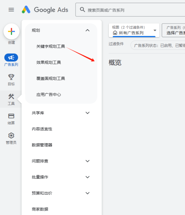 關(guān)鍵字規(guī)劃工具在左側(cè)邊欄的工具,規(guī)劃下面。如圖: