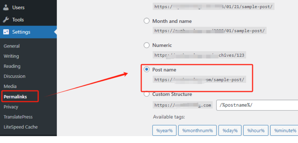 URL中包含關(guān)鍵詞對SEO有幫助。保持URL簡潔、清晰,并避免過長。在Wordpress里面找到 sittings里面的permailinks,選擇post name。如圖: