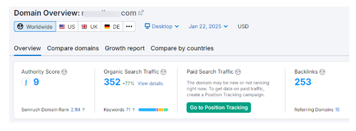 SEMrush數(shù)據(jù):通過semrush查看,目前出詞已經(jīng)有1.3K,慢慢有了流量。注意:這里的我還沒有讓他去做外鏈,純站內(nèi)優(yōu)化。如圖: