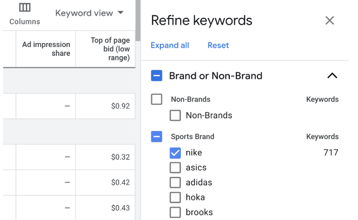點擊“全部展開”,取消勾選任何不相關(guān)詞語旁邊的框(例如,你不銷售的品牌名稱)。這將從你的結(jié)果中刪除相應(yīng)的關(guān)鍵詞。如圖: