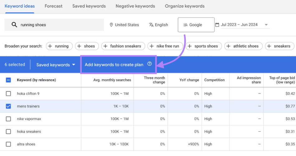 一旦你知道你想用于廣告的詞語,你可以通過勾選它們旁邊的框并點擊“添加關(guān)鍵詞以創(chuàng)建方案”(之后,“添加關(guān)鍵詞”)來保存它們。如圖: