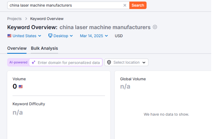 假如你是做激光機的,那“中國激光機生產商”這種詞,你會覺得很準確也很有用,但是你忽略了一件事,就是外國客戶會不會用這種詞去搜索。