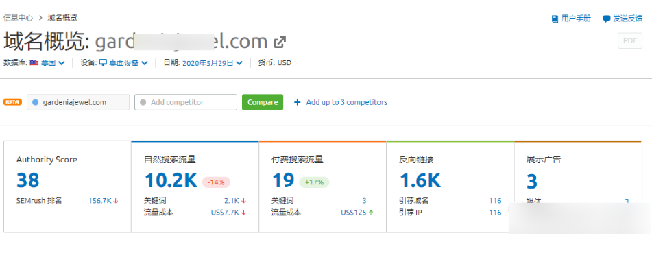 域名概覽:你在這里可以直接輸入競(jìng)爭(zhēng)對(duì)手的域名,然后可以看到自然流量,付費(fèi)流量,反向鏈接,最重要的你還可以看到競(jìng)爭(zhēng)對(duì)手跑的谷歌廣告,可以查看到跑了那些關(guān)鍵詞,這個(gè)功能十分的點(diǎn)贊。如圖: