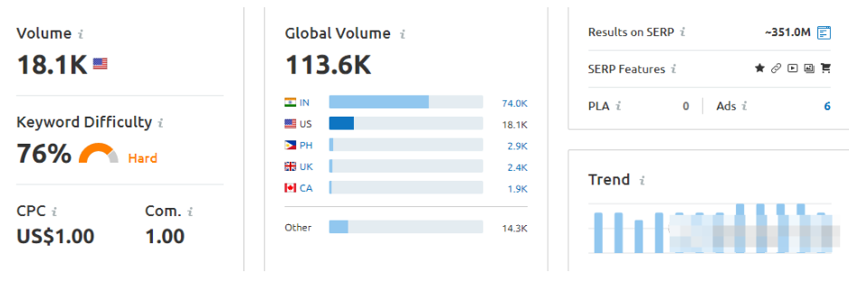 我這里就簡(jiǎn)單的說下關(guān)鍵詞概覽的功能,你需要先輸入關(guān)鍵詞,然后可以看到這個(gè)關(guān)鍵詞的seo難度,月均搜索量,谷歌廣告cpc價(jià)格,同時(shí)還可以看到不同國家的搜索量情況,以及相近的關(guān)鍵詞,針對(duì)這個(gè)關(guān)鍵詞提出的問題等等。如圖: