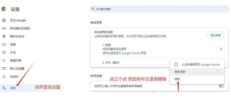 2.進瀏覽器的設(shè)置-找到語言設(shè)置-把中文刪了