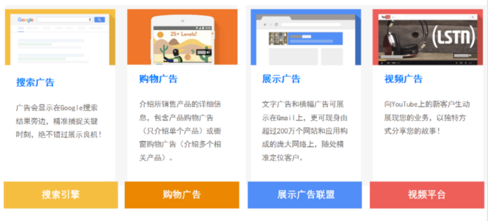 谷歌廣告類型主要有搜索廣告、購物廣告、展示廣告和視頻廣告。