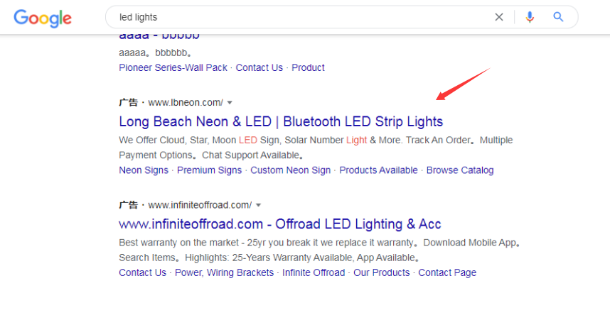 比如我是一個LED商家,為”LED Lights”這個關鍵詞投放了廣告。