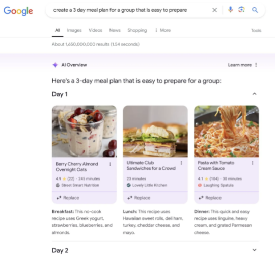 此外,谷歌還希望使用Gemini作為智能體Agent來完成膳食或旅行計(jì)劃等任務(wù)。用戶可以輸入諸如“為四口之家計(jì)劃三天的膳食”之類的查詢,并獲取這三天的鏈接和食譜。